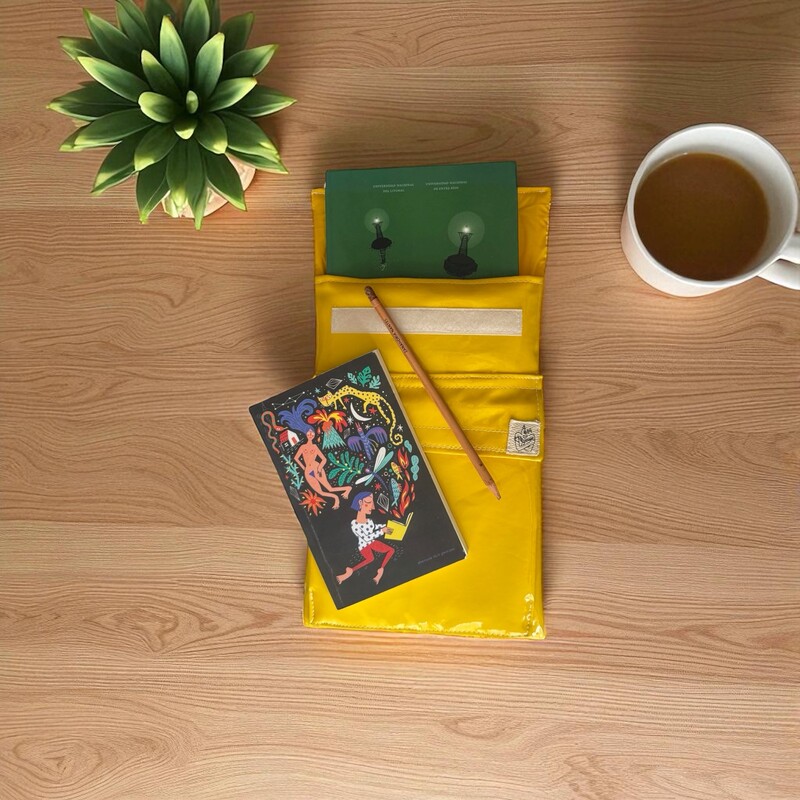 Portalibros 100% artesanal diseñado en la Ciudad de México, producido por mujeres de manera artesanal, local y en pequeña escala, siguiendo los lineamientos del slow fashion. Este portalibros posee dos bolsas: una principal y una frontal. En la principal caben aproximadamente dos libros estándar y en la frontal, más pequeña, un libro de bolsillo y un iPad o un lector electrónico junto con una libreta y otros objetos que acompañen tu lectura como lápices, plumas, separadores, etc. Además, son impermeables y acolchados por lo que evitarán que los objetos y libros guardados en su interior se dañen o mojen por golpes, derrames o exposición a la lluvia.