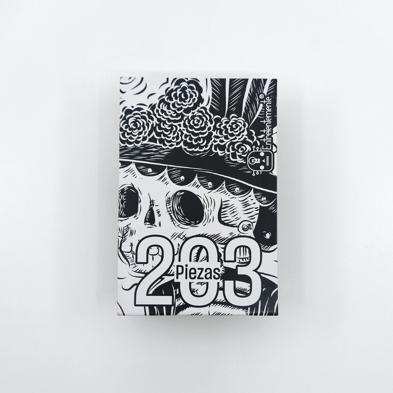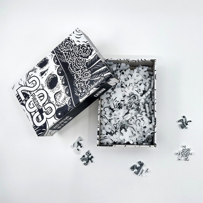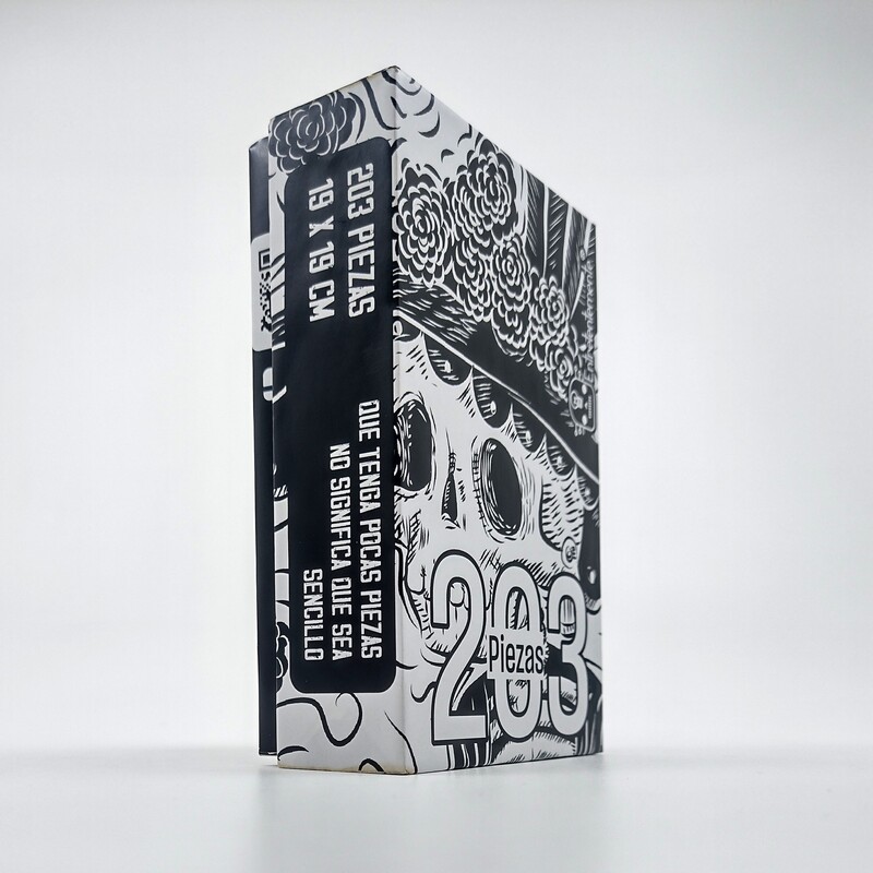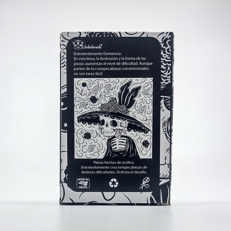 Este rompecabezas de la línea “La cuarta demencia” está ilustrado con una espléndida representación de la emblemática Catrina, que juega con el contraste a blanco y negro para darle un toque extra de complejidad.