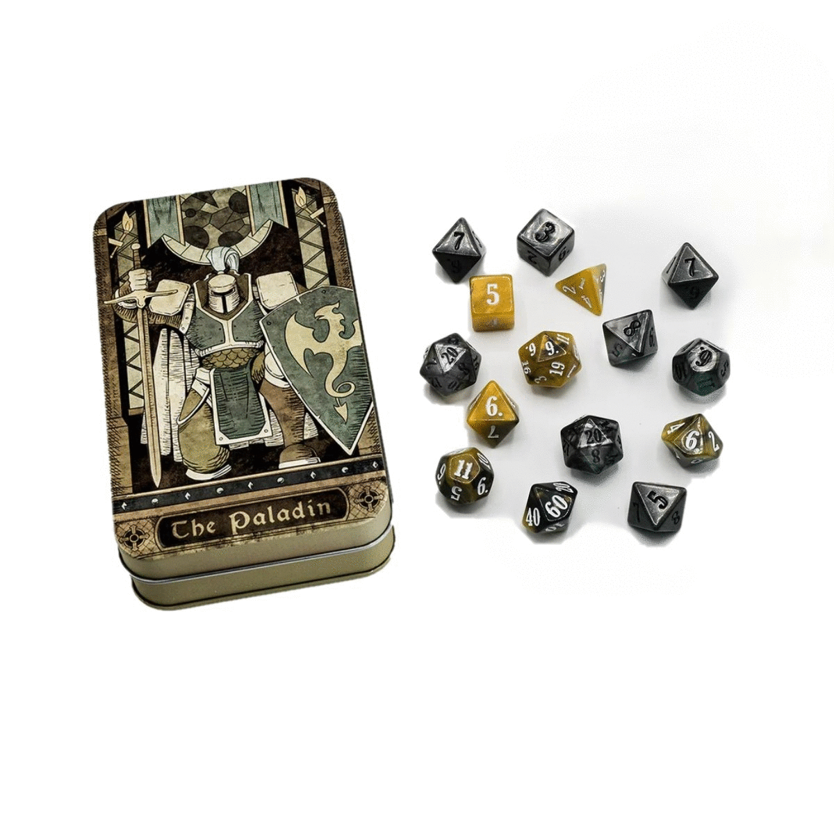 Abre esta lata y libera 15 dados en dos diseños de colores, con d8 para golpear y un d6 y un d12 adicionales para el daño del arma de tus poderosas espadas.