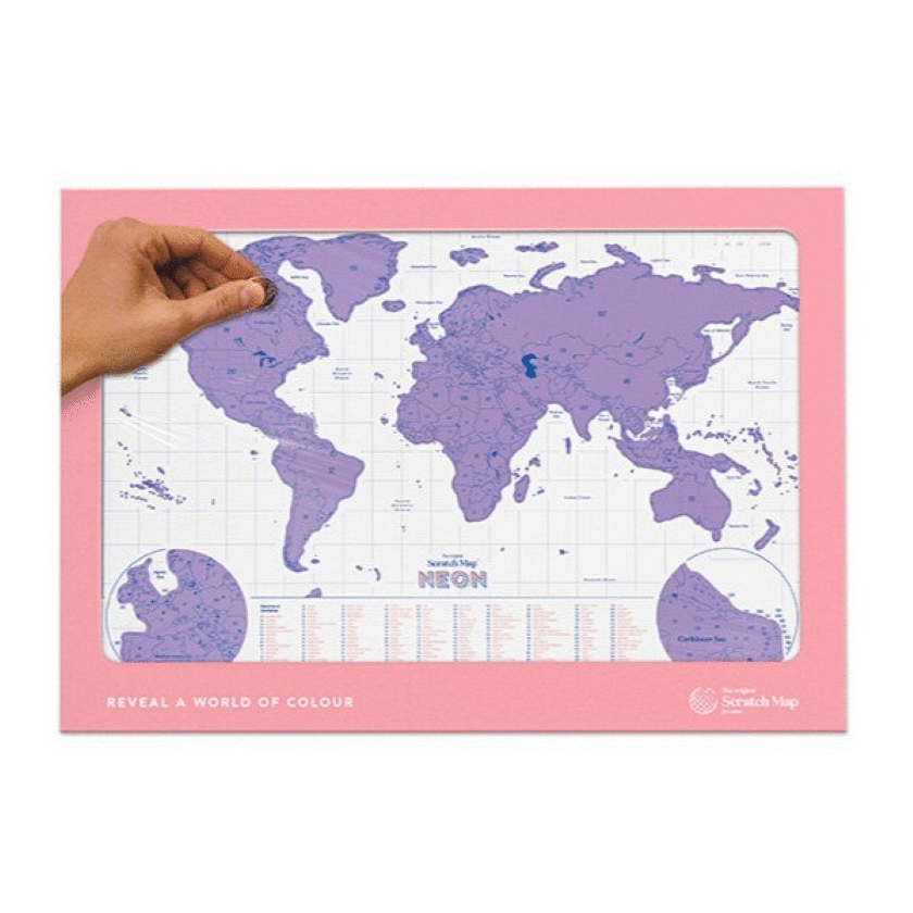 Marca aquellos lugares a los que has viajado y decora tu pared con un colorido mapa del mundo. Como si fuera una quiniela de rasca y gana, rasca el mapa para marcar todos los lugares que has visitado. Además, la edición Neón del Scratch Maprevelará un vibrante mapa en contraste debajo de la lámina superior.