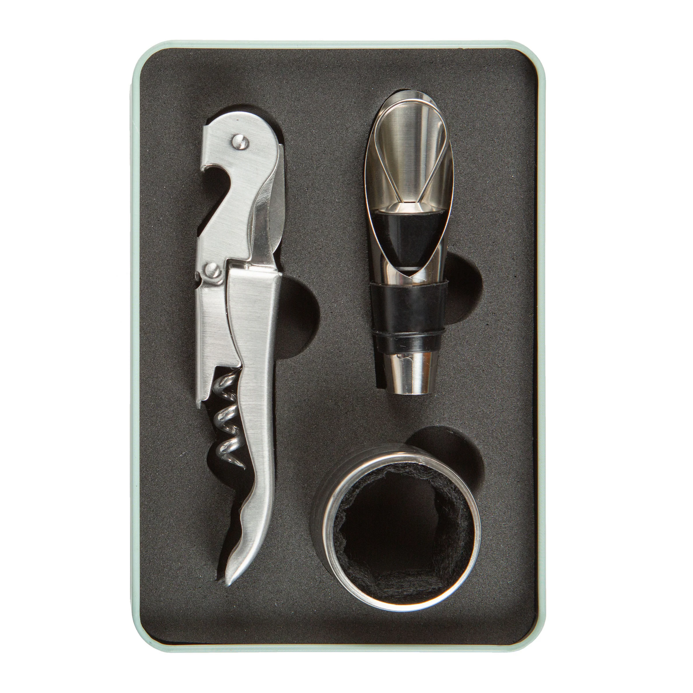 Kikkerland presenta el kit definitivo para entusiastas del vino. Se trata de un set práctico, fácil de almacenar y muy completo, por lo que podrás llevarlo contigo a todas partes. Incluye: 1 sacacorchos, 1 decantador de boquilla, tapón y anillo antigoteo. Todo, dentro de una elegante caja de lata que te permitirá tener a la mano las herramientas esenciales para disfrutar una de tarde de vino.